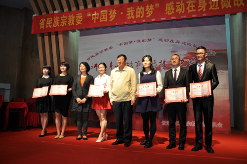 為(wèi)紀念中(zhōng)國(guó)人民(mín)抗日戰争暨世界反法西斯戰争勝利70周年,由雲南省民(mín)族宗教委辦(bàn)公(gōng)室、機關黨委、委工(gōng)會、信息中(zhōng)心、《今日民(mín)族》雜志(zhì)社聯合主辦(bàn)的“中(zhōng)國(guó)夢-我的夢”主題系列活動于9月1日在我館舉行。活動分(fēn)為(wèi) “中(zhōng)國(guó)夢-我的夢”感動在身邊微故事講演比賽和紀念中(zhōng)國(guó)人民(mín)抗日戰争暨世界反法西斯戰争勝利70周年知識競賽兩部分(fēn),省民(mín)宗委黨組成員、副主任楊誼群、黨組成員蒙東平等領導出席了活動。省民(mín)宗委機關、省級宗教聯合工(gōng)會、信息中(zhōng)心、民(mín)語委辦(bàn)、古籍辦(bàn)、民(mín)博、民(mín)族中(zhōng)專、出版社、《今日民(mín)族》雜志(zhì)社等單位選派代表(隊)參加。我館選派羅文(wén)宏參加講演比賽并獲得一等獎;周浩玲、程曉丹、王靜組成代表隊參加知識競賽并獲得組織獎,王靜獲得優秀選手獎。